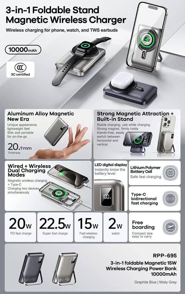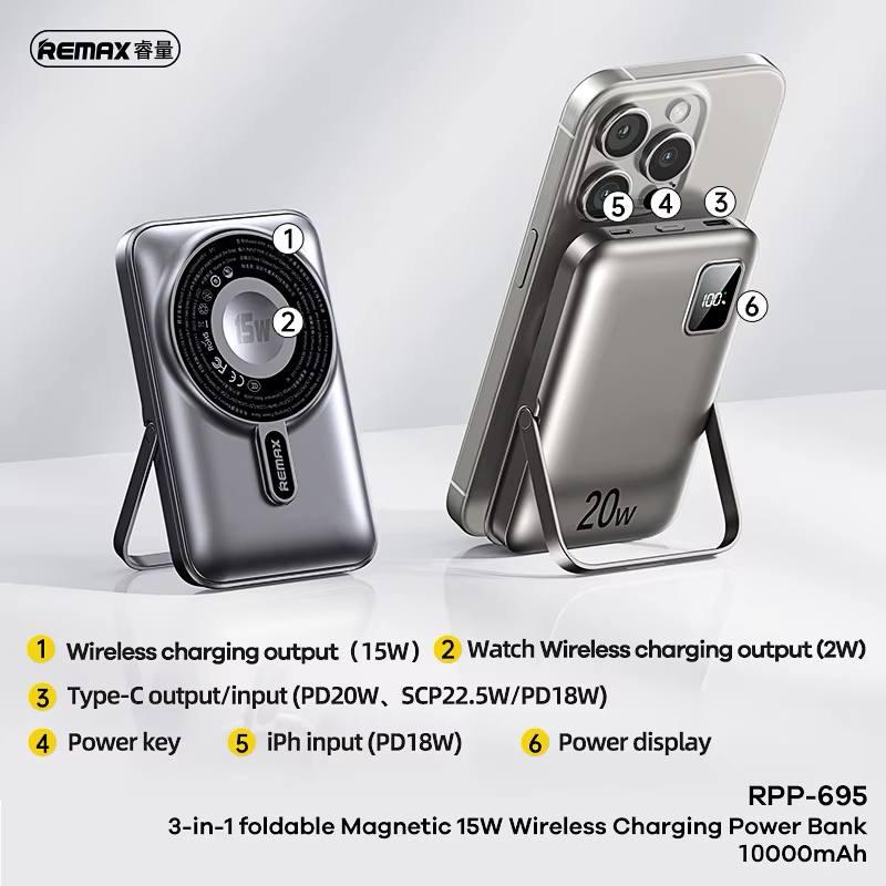 پاوربانک سهکاره ریمکس مدل Powerbank 10000 با شارژر مگسیف، وایرلس ۱۵ وات و استند تاشو | همراه اکسسوری