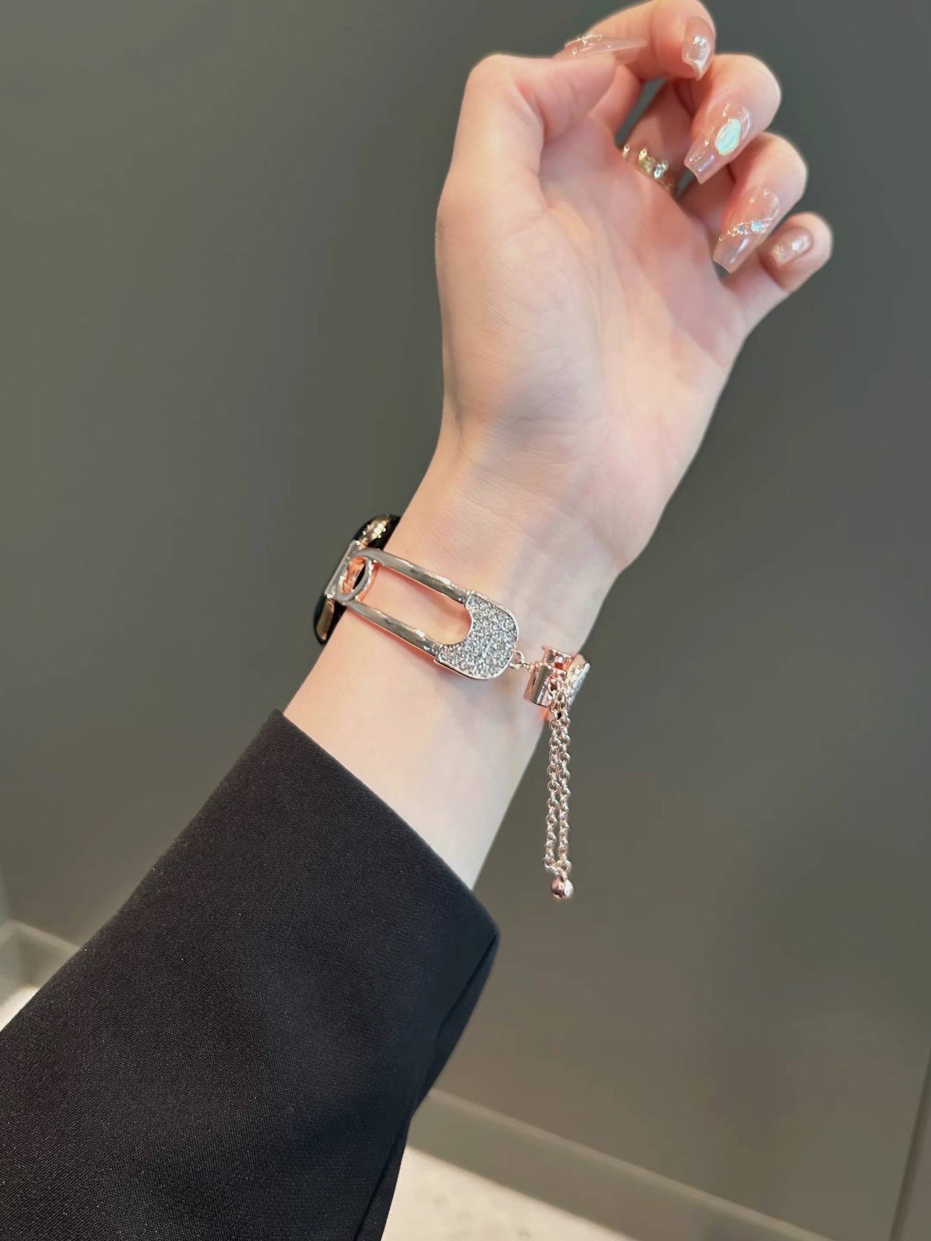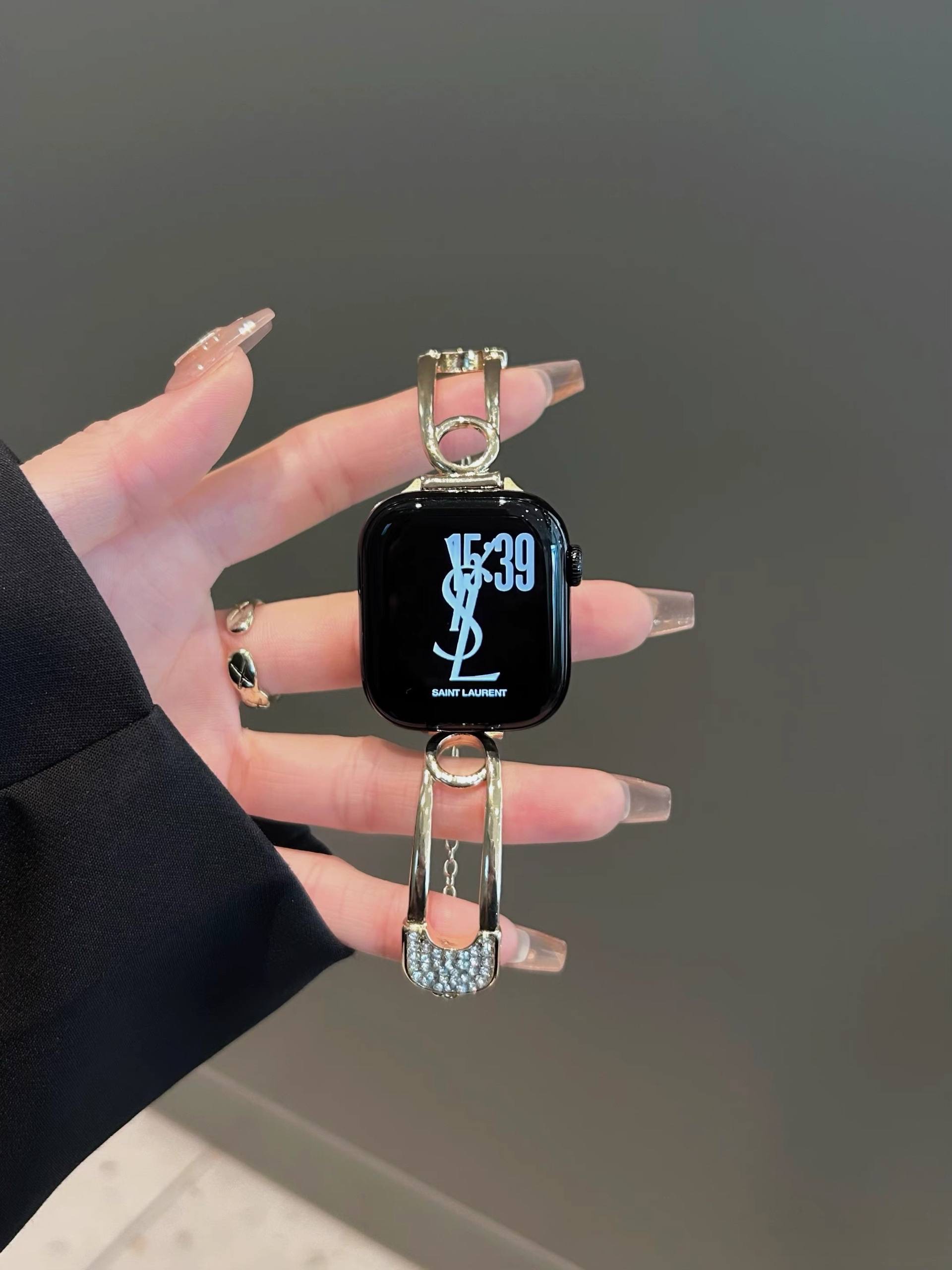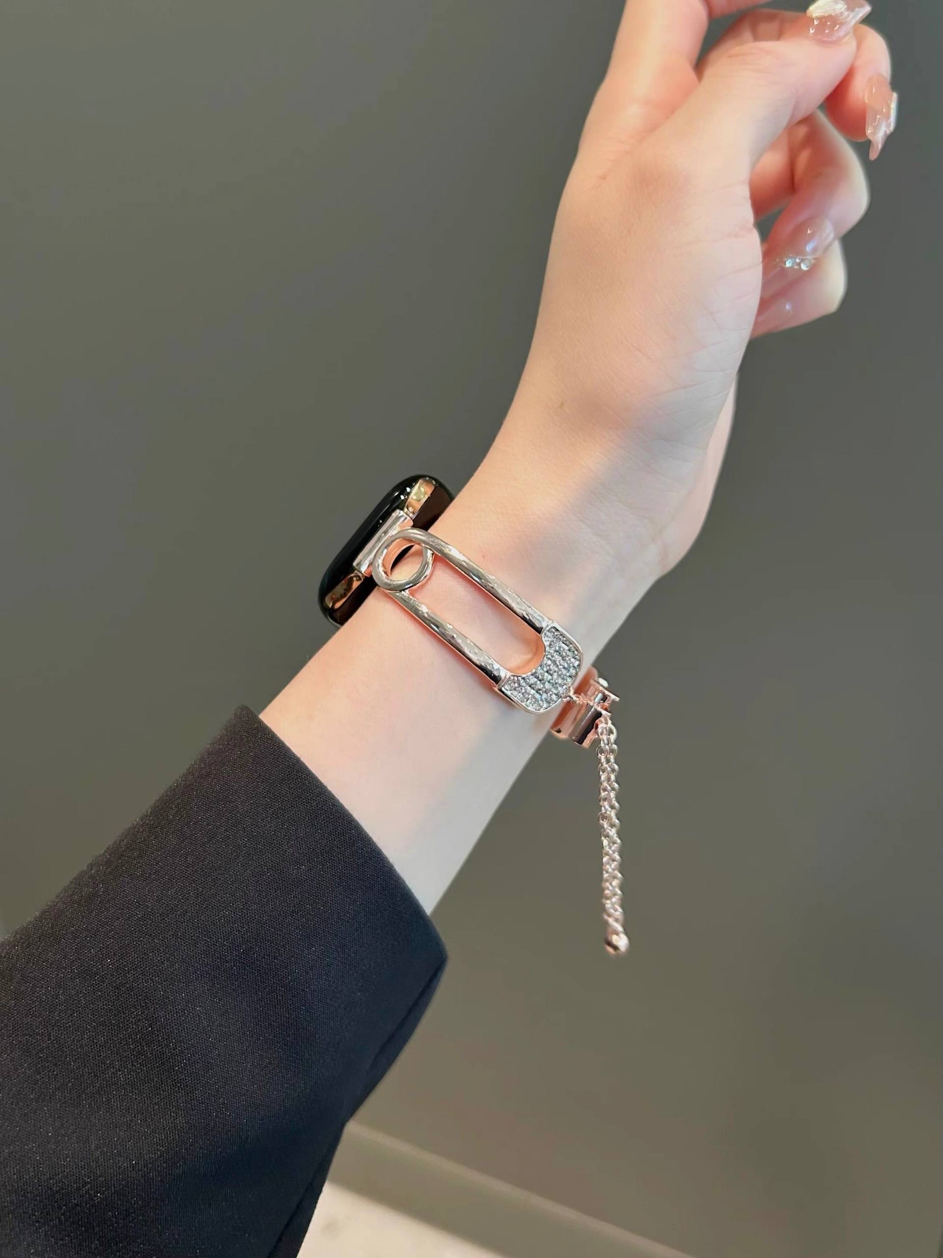 بند اپل واچ طرح سنجاق مد شده نگین دار همراه اکسسوری از نظر طراحی ظاهری متفاوت با بندهای معمولی ارائه می دهد و برای کاربرانی که به دنبال جلوه بصری خاص هستند جذابیت دارد. استفاده از نگین های ریز باعث افزایش جلوه تزیینی شده و در نور محیط جلوه درخشان ایجاد می کند.
